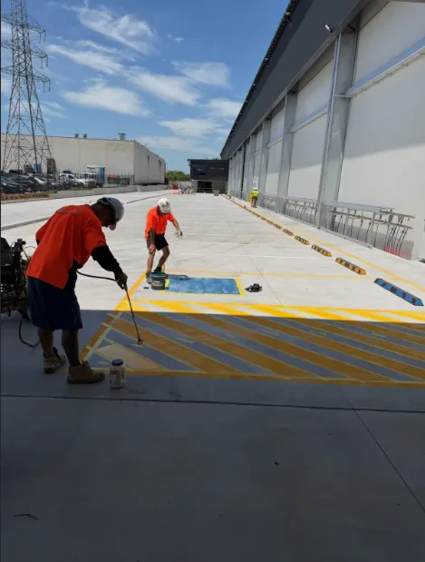 Bay layouts, directional arrows, accessible bays, no-stopping zones. AS 2890 compliant installation for industrial sites.